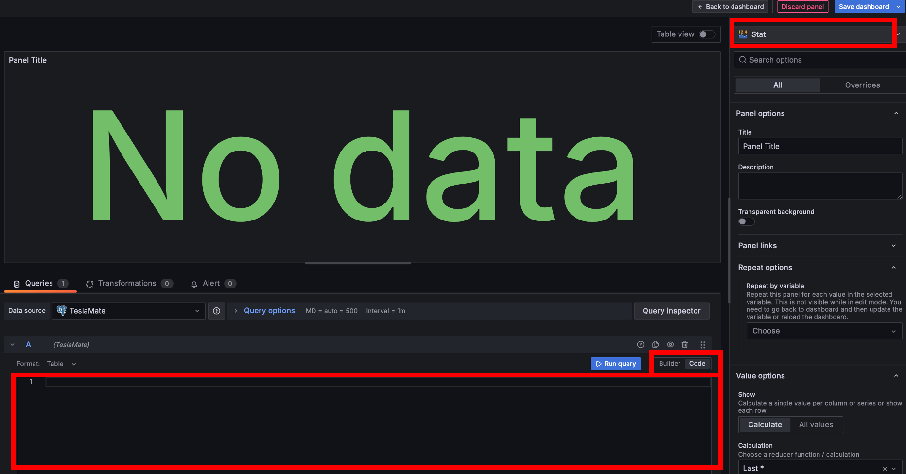 Dashboard → Edit → Visualization 으로 들어가면 대시보드에 표시할 수 있는 판넬을 제작할 수 있다. 여기서 오른쪽 위에서 Stat을 선택해주고, 왼쪽에서 Code를 선택하면 아래 sql 코드를 작성할 수 있는 창이 뜨게된다.