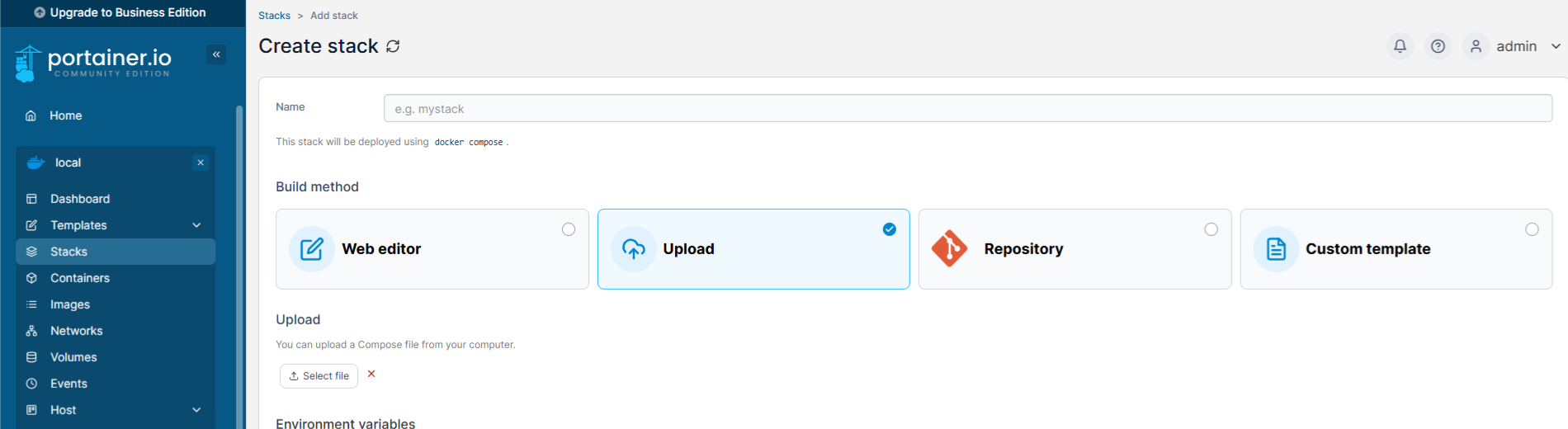 파일을 준비한 다음에는 Portainer에 들어가서 → local → Stacks → +Add stack (우측위) → upload file → docker-compose.yml 업로드 → Deploy the stack 을 하게되면 설치가 완료된다.