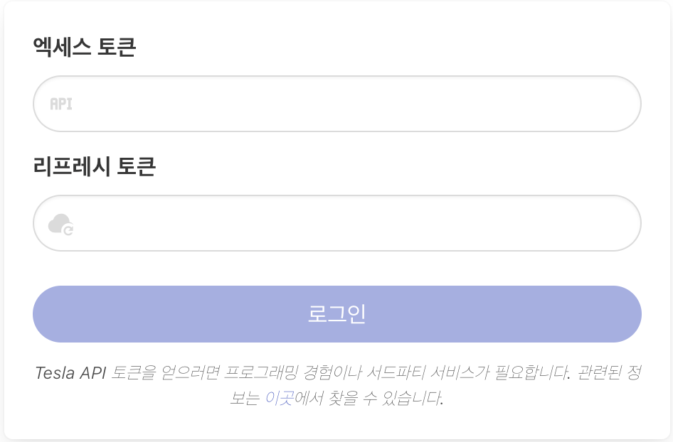 여기서 바로 이용할 수는 없고 테슬라 API key (token) 를 받아와야 한다. token를 받아오는 방법은 여러가지가 있지만, 나는 Auth app for tesla 를 통하여 token을 받아왔다.