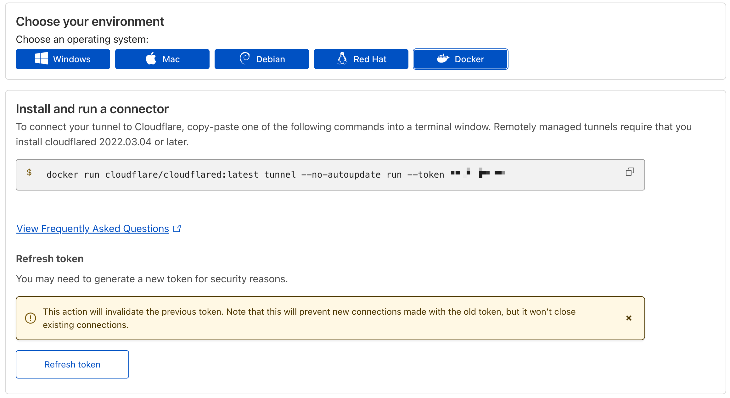 이후가 중요한데, 내 proxmox에 있는 Docker에 cloudflare 터널의 출구를 설치해서 연결할 예정으로 Choose your enviroment에서 Docker을 선택한다. 그러면 아래처럼 명령어가 나온다.