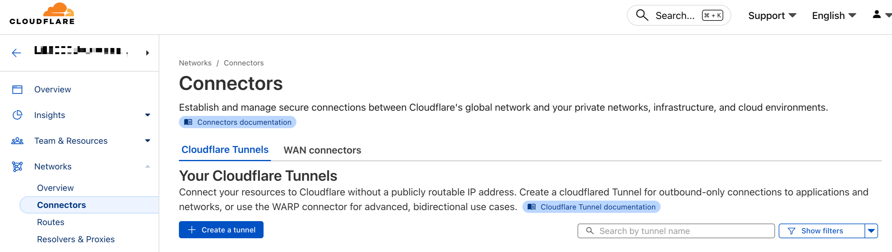 Network - Connectors 에서 create a tunnel 을 눌러서 터널을 뚫자. 도메인은 미리 준비하자